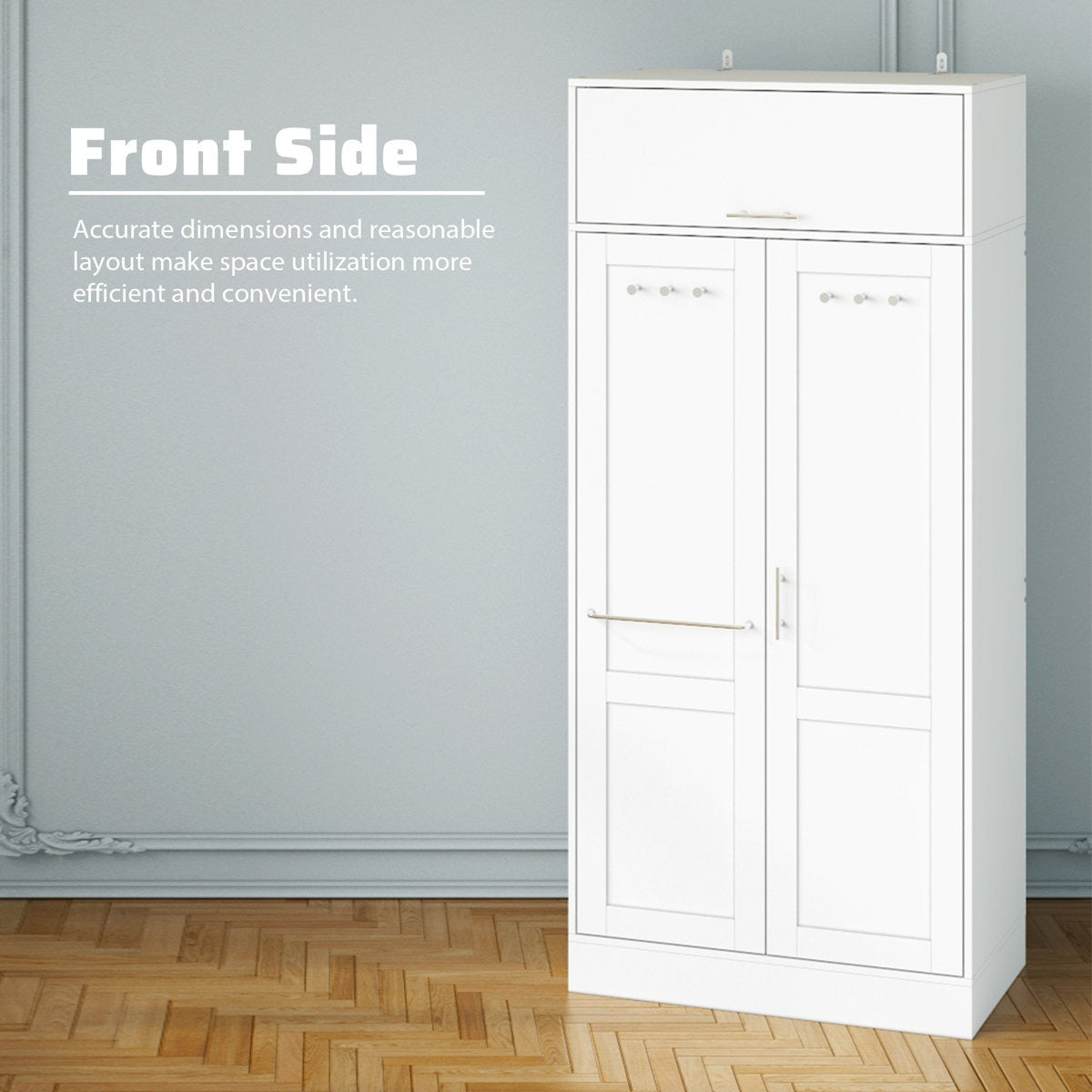 The unique double-door design ensures privacy and protection for your belongings, while the high-quality construction guarantees long-lasting performance. Inside, metal hooks provide a convenient place to hang hats, scarves, ties, and other accessories, keeping everything neatly organized. A top cabinet with a hydraulic lever offers extra storage for seasonal items, boxes, or infrequently used belongings, helping you maximize your space efficiently.