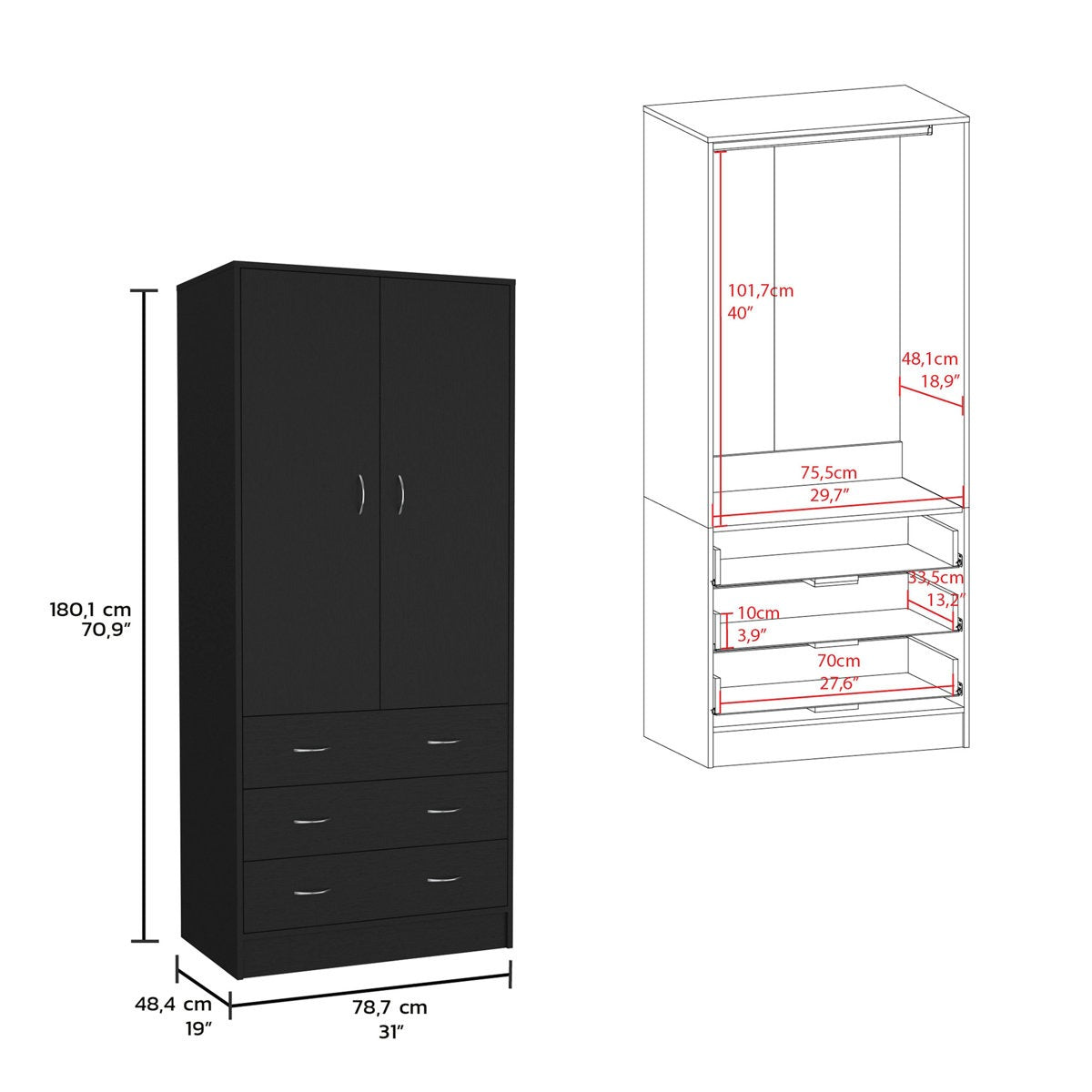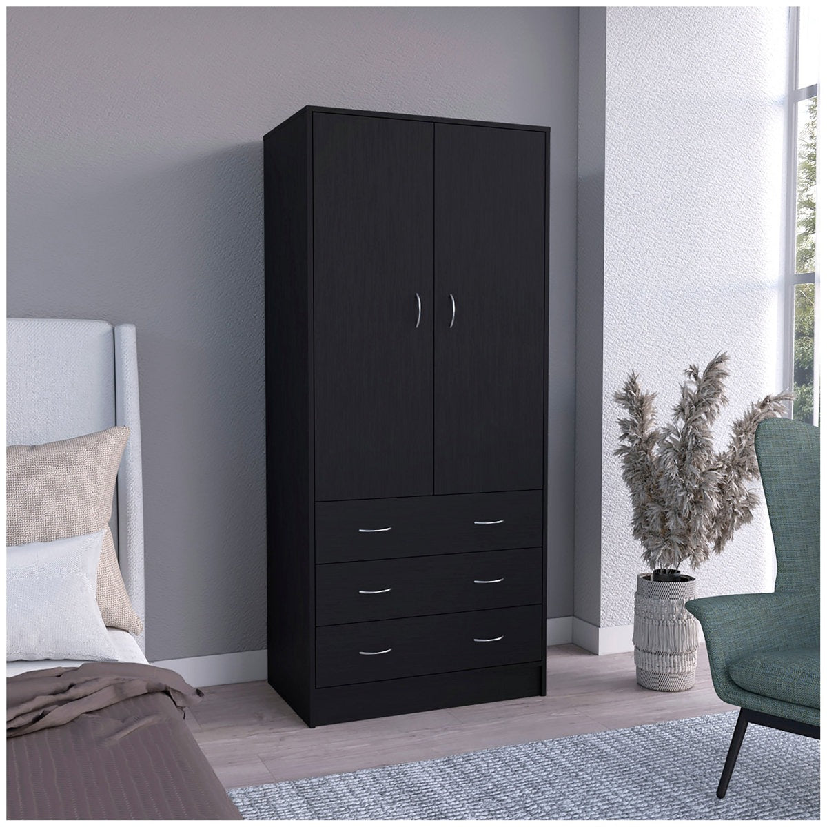Bring order and elegance to your space with the Noa 2-Door Wardrobe. Designed to simplify your daily routine, it offers ample space for hanging garments, storing folded items, and tucking away seasonal pieces. Whether you’re optimizing a small room or expanding storage in a larger space, this black modular wardrobe delivers timeless style and everyday practicality.