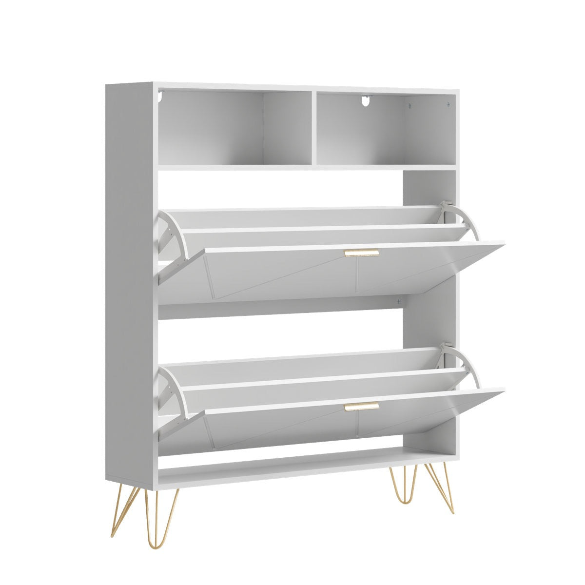 Two flip drawers, each fitted with a 2-position adjustable and removable panel, allow you to organize shoes of various sizes and styles—from sneakers to heels—with ease. -