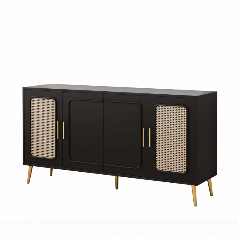 Finished in a refined black PU paint, the four-door design delivers generous concealed storage for dining essentials, décor, or everyday belongings. The look is elevated by slim gold-finished legs and handles, creating a striking balance between modern luxury and timeless charm.