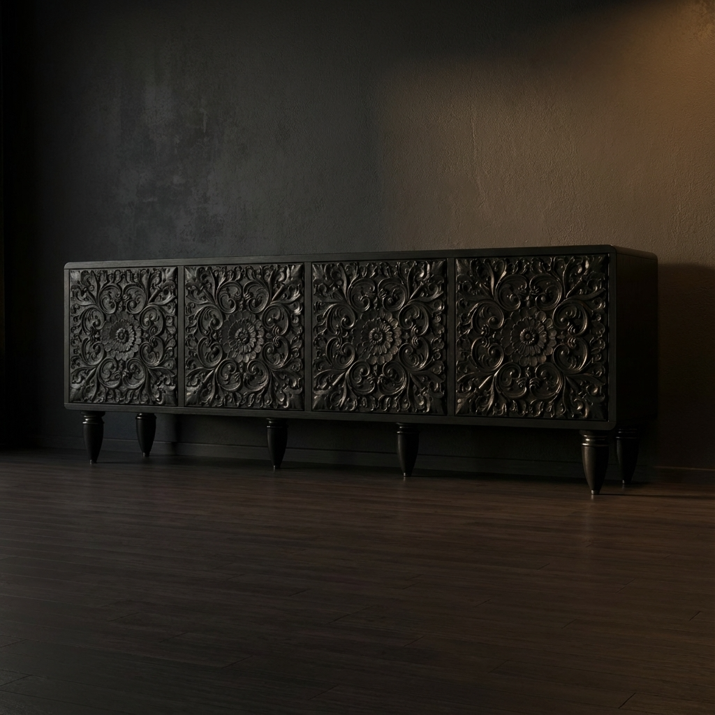 The ROLI Sideboard is a celebration of craftsmanship and modern luxury. Designed with intricate CNC-carved detailing, this piece transforms functional storage into a refined design statement. The detailed patterns across the four doors add depth, texture, and timeless elegance to contemporary and classic interiors alike.