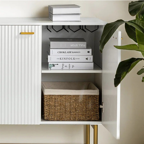 The white sideboard is finished with a laminated, water-resistant surface, making it easy to maintain and suitable for everyday use. It can be cleaned easily with a damp cloth, keeping it looking new for years.