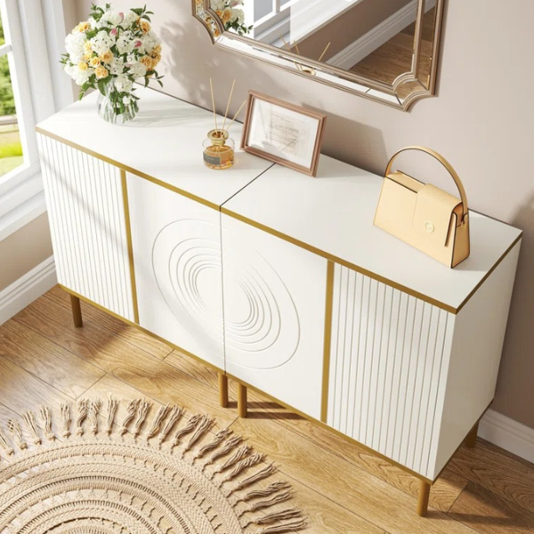 Elegant Design- The white and gold finishes and unique pattern on the doors make this white buffet cabinet an eye-catching piece of furniture that’s sure to enhance the style of any dining room.