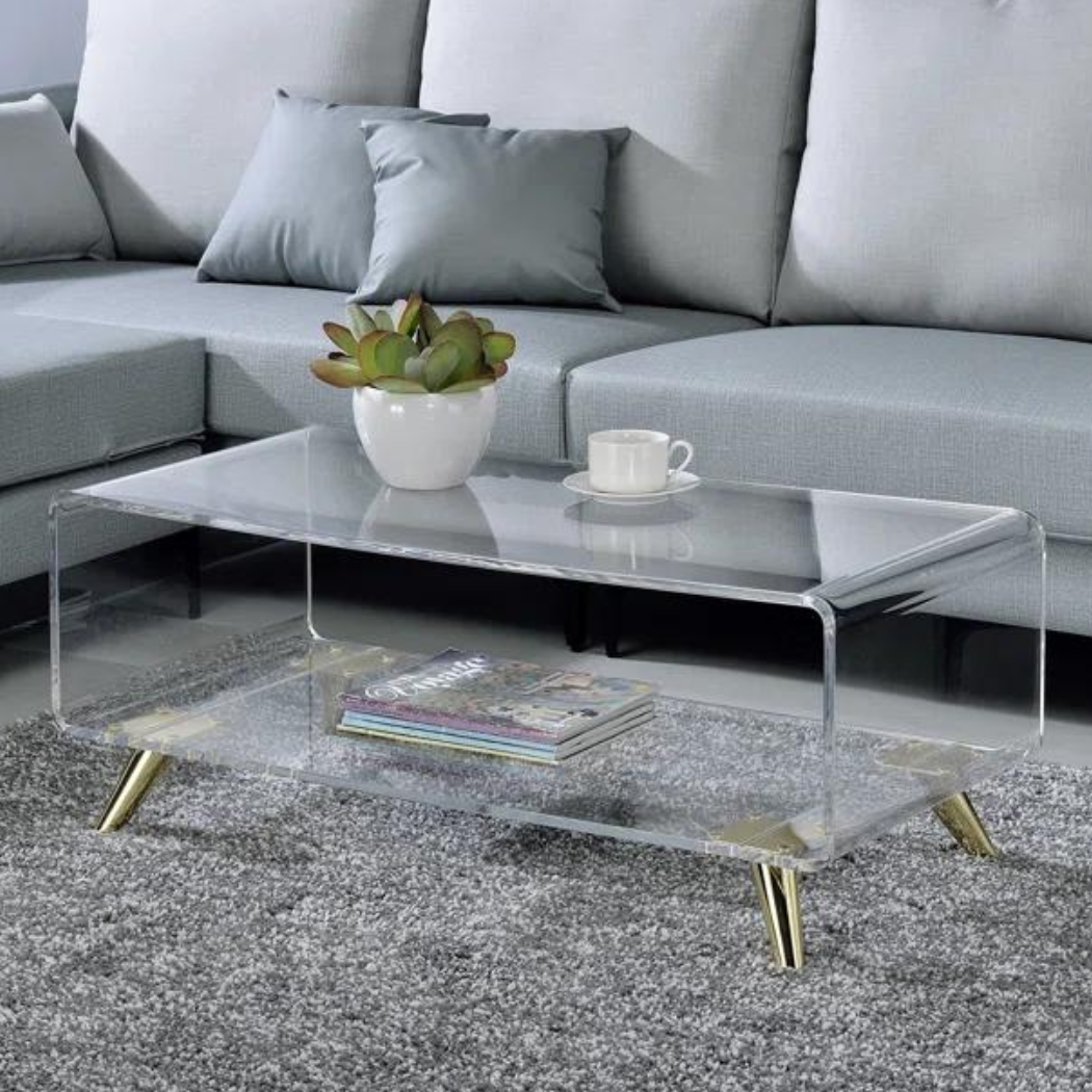 This Clear Acrylic Coffee Table is a stunning addition to any modern home or office space. Featuring a waterfall-edge design, it embodies simplicity and elegance with its clean lines and transparent frame. The table offers two-tier storage, providing both functionality and a minimalist aesthetic that blends seamlessly with any decor style. Supported by angled gold metal legs, the design combines durability with a luxurious touch, making it an eye-catching yet practical piece.