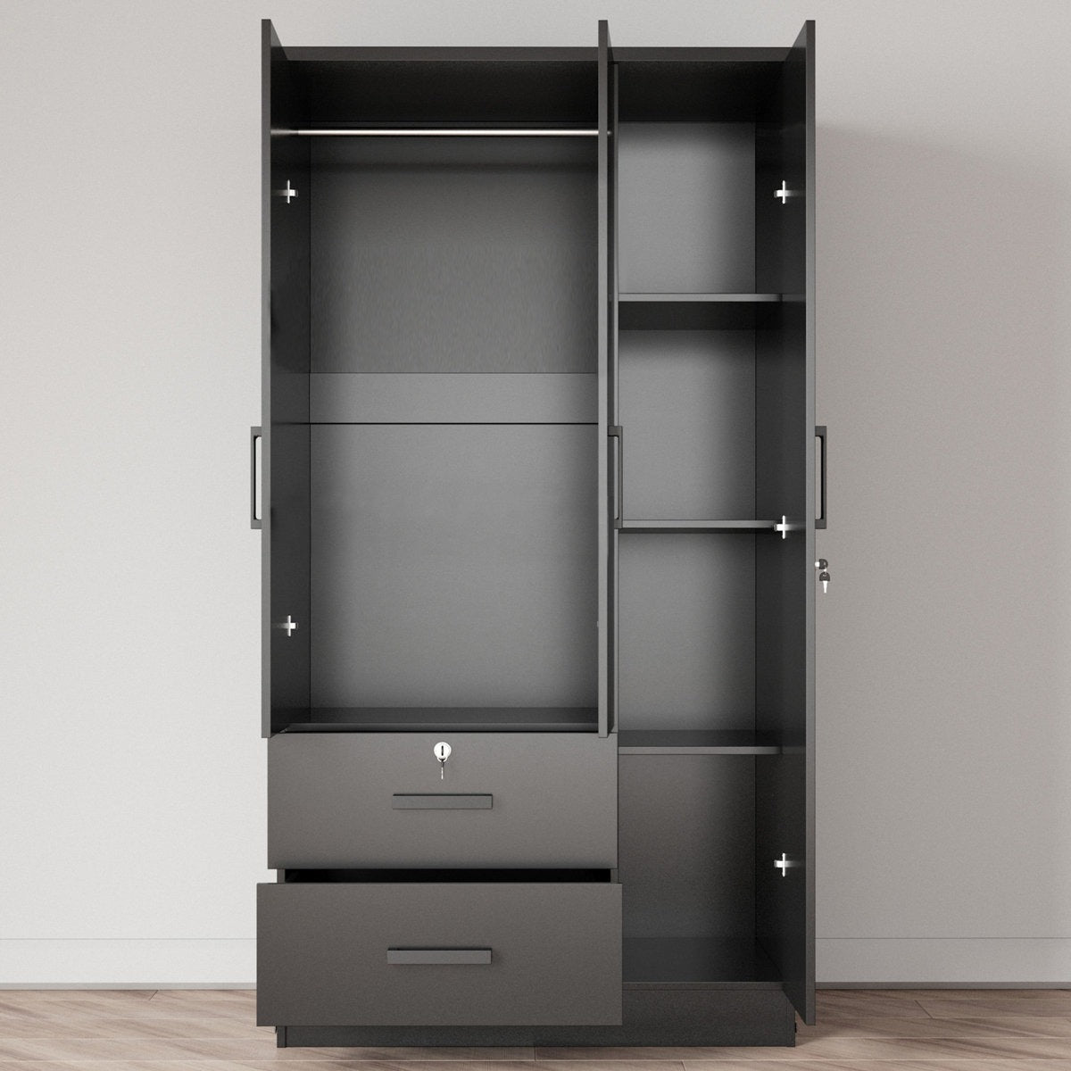 Designed for everyday convenience, the Minji Wardrobe offers a well-organized interior: